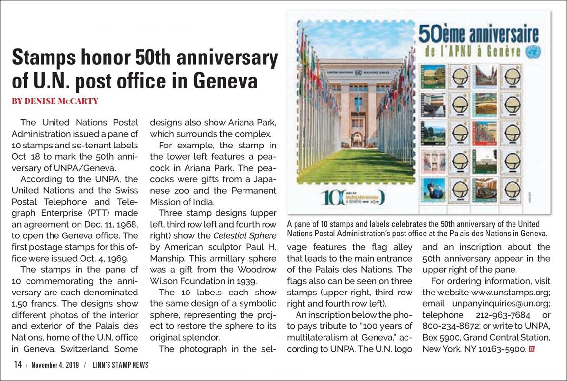 Except from the LINN’S STAMP NEWS of 4 November 2019, Vol.92, No. 4749, Page 14. 50th Anniversary of the United Nations Post Office in Geneva. The first stamps of this office were issued on 4 October 1969. |