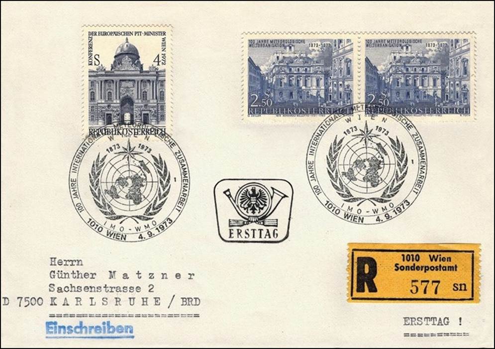 Registered FDC with the special WMO cancel; inscription “100 years of International Meteorological Cooperation 1873 - 1973.” All anniversaries of WMO are based on the 1873 founding conference. Photo Credit: The Journal of the United Nations Philatelists - Vol. 49 #2, April 2025.
