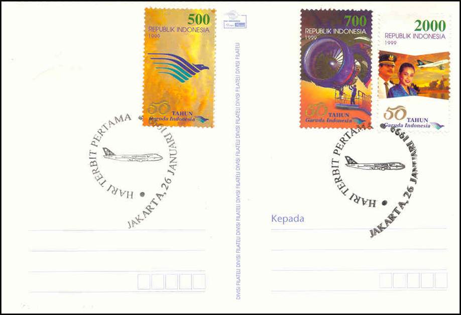 Back of the above maximum card showing the 3 stamps issued on 26 January 1999 to commemorate the 50th anniversary of the Garuda Indonesia. Postmark designed in the form of digit 9 to denote the year 1999. The stamp designs show (from left to right):
