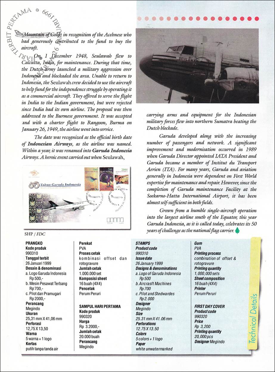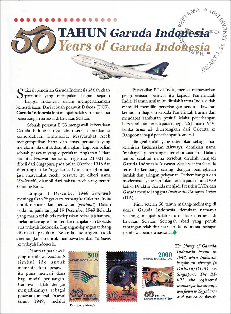 Background: The history of Garuda Indonesia, Indonesia’s flag carrier, started when the businessmen and the people from Aceh gathered funds to purchase an aircraft. Full account on this issue can be obtained by clicking on the following link: Indonesia – From the Seulawah to Garuda Indonesian Airways and from the following philatelic notice: