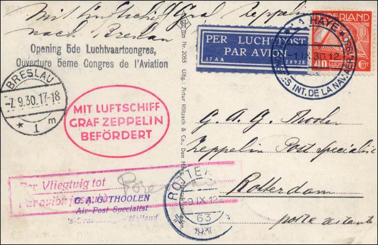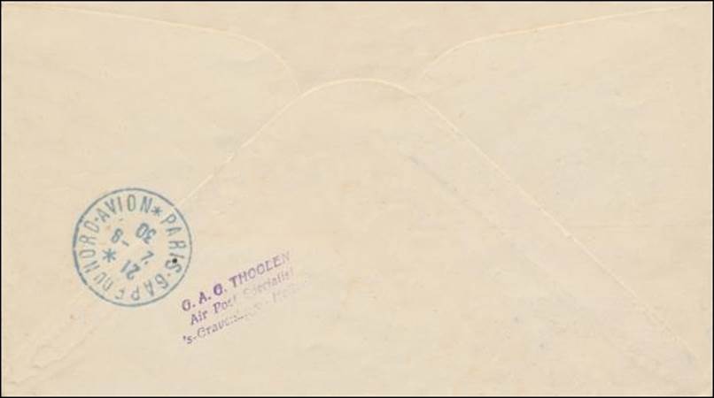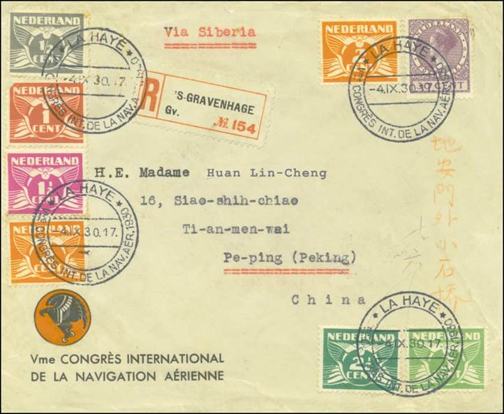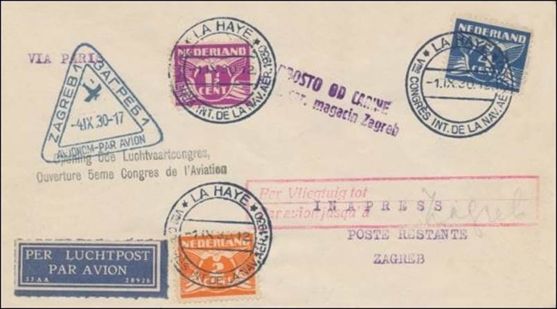 1930 International Aviation Congress "LA HAYE" cover sent to a “poste restante” address in Zagreb, endorsed Via Paris. Franked with Dutch 1½-cent magenta, 2-cent orange and 4-cent blue stamps, all of the 1924/28 "Carrier Pigeon" definitives. Special congress postmark; hand-stamp on 2 lines "Opening 5de Luchtvaartcongress / Ouverture 5eme Congress de l'Aviation" at left. Box "Per Vliegtuig tot / Par avion jusqu'à" followed by "Zagreb" hand-written. At upper left Yugoslav triangular hand-stamp "Zagreb 1 / Avinom - Par Avion / 4. IX 30", Two lines Yugoslav cachet in violet meaning "No customs duty". On the back hand-stamp with "Paris Gare du Nord Avion 21.9.30". |