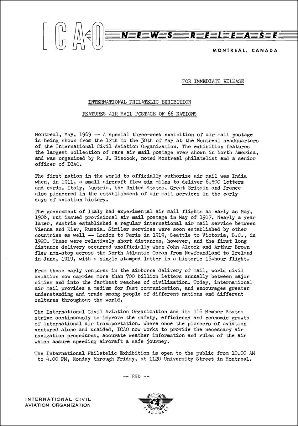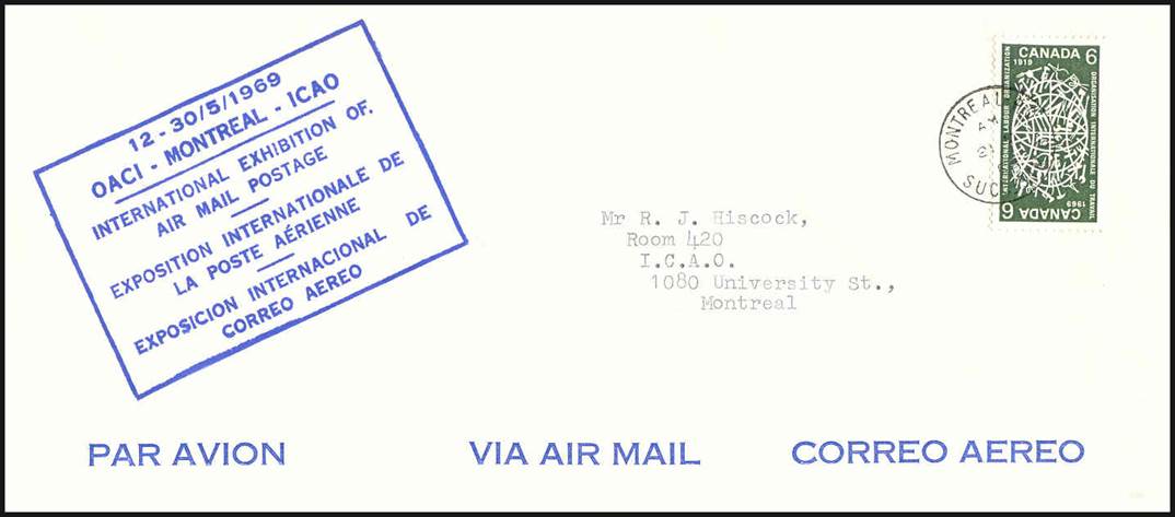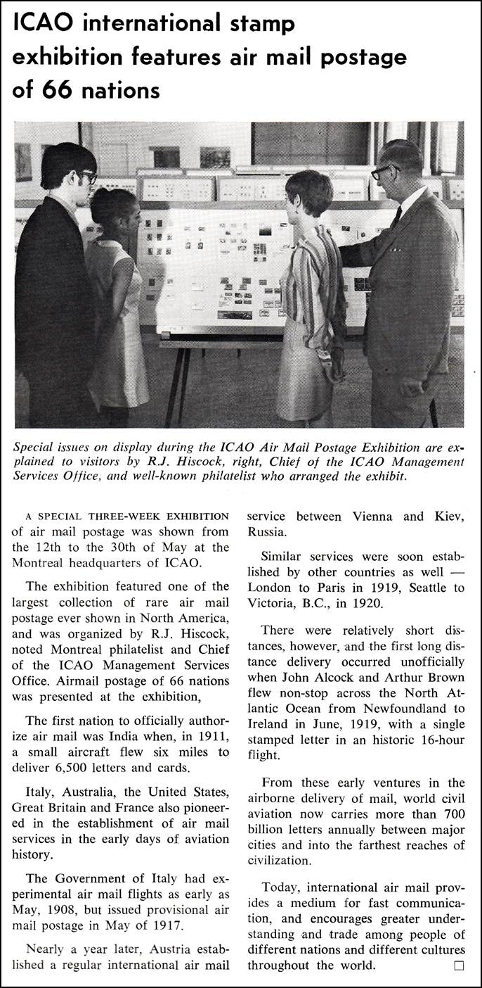 A special three-week exhibition of airmail postage was shown from 12 to 30 May 1969 at the Montreal headquarters of ICAO to mark the 50th anniversary of Alcock and Brown’s feat. The exhibition featured one of the largest collection of rare air mail postage ever shown in North America, and was organized by Mr. R.J. Hiscock, noted Montreal philatelist and Chief of the ICAO Management Services Office. Airmail postage of 66 nations was presented at the exhibition. Some 165 officials (Consular Officials, Airline Managers, IATA Officials, the Postmaster of Montréal, Council Members, and Representatives of some 30 philatelic clubs) attended the official opening on 12 May.