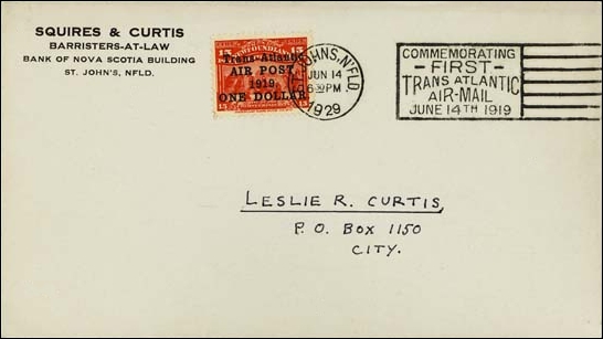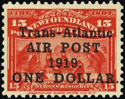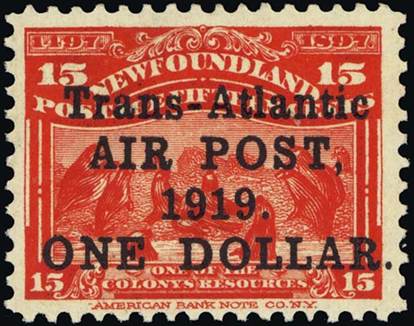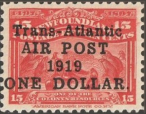The exploits of Alcock and Brown were noted philatelically at that time when Newfoundland was taking advantage of fledgling flights by issuing special overprints. On 9 June 1919, the post office of Newfoundland had overprinted 10,000 of the 15-cent stamp Scott #70, issued on 24 June 1897 for the 400th anniversary of John Cabot’s discovery of Newfoundland and the 60th year of Queen Victoria’s reign, with the text Trans-Atlantic/AIR POST,/1919./ONE DOLLAR., to become Scott #C2 (according to Scott catalogue), in four black lines; some of these overprints exist without the comma after AIR POST and/or no stop after 1919.