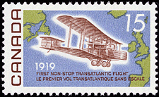 The Canadian stamp (Scott #494), issued on 13 June 1969 for the 50th anniversary of the first non-stop transatlantic flight, shows the Vickers Vimy and a map of the Atlantic.