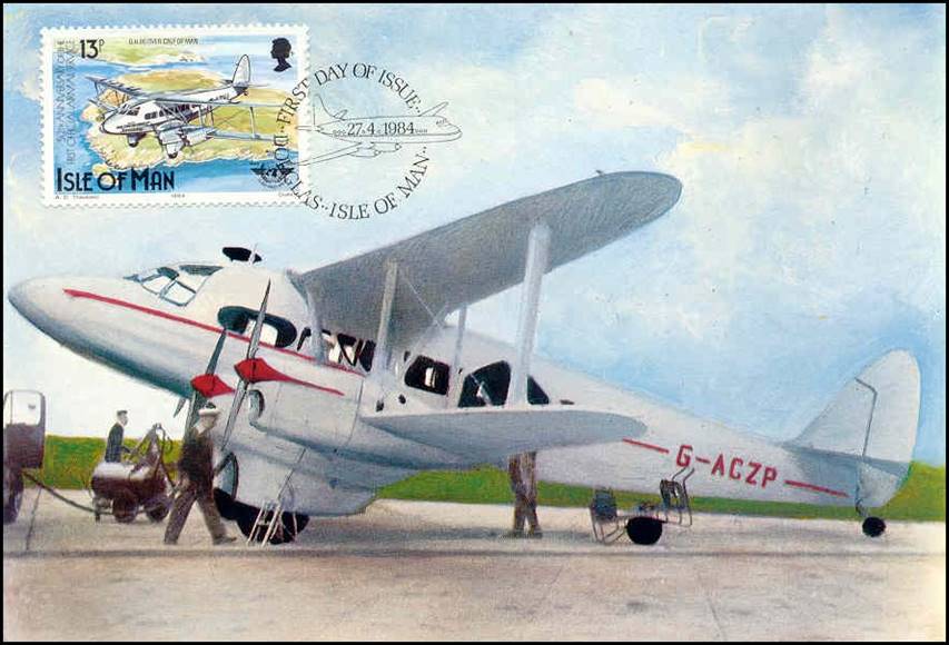 First Airmail Service The Isle of Man was served by Ronaldsway airport in the South-West of the Island. During the 1920s airplanes occasionally landed in a field at Ronaldsway farm, Derbyhaven, near Castletown. In October 1934, Capt. Olley obtained landing rights in this area and adjoining 20-acre field and founded Isle of Man Air Services to run the aerodrome. The area was levelled, drained and extended in 1935. After further improvements in the 1940s, Ronaldsway became the main Isle of Man airport and is still open today. In 1934, inland airmail began with the town-to-town service. This served major centres such as London, Birmingham, Manchester, Liverpool, Cardiff, Belfast and Glasgow. It was initially an experimental service with de Havilland D.H.86 (which first flew on 14 January 1934), but it lasted until World War II. The Island's first experimental airmail service was started with using a newly delivered Railway Air Services de Havilland D.H.84 Dragon Mk 2, registered G-ACXI, on 20 August 1934. This operated on the route Glasgow-Belfast-Isle of Man-Manchester (southbound run). Capt. Gordon Store landed the Dragon MK 2 at Ronaldsway on that day. The number of letters and postcards carried on the first flight was 797; weather conditions on the flight were turbulent. Letters weighing less than 2 ounces (57 g) were carried at no extra cost. An air mail service ceased in late September; the main reason cited was an unsuitable landing ground for winter operations, as Ronaldsway was deemed not up to the required standard. Blackpool and West Coast Air Services resumed the air mail service from February to October 1935; and from 1st November 1935, United Airways (formed in 1935) secured the main contract from the Post Office.