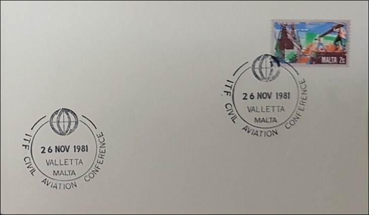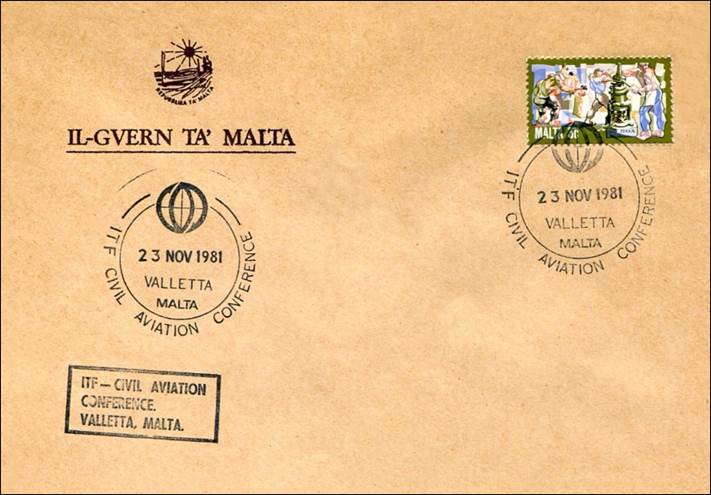 A special souvenir cover was issued on this occasion (see here below). A temporary Branch Post Office was opened at the Mediterranean Conference Centre, Valletta, from 23 to 27 November 1981. Postal articles sent from this temporary office were postmarked with a date stamp inscribed with the following words: ''ITF - CIVIL AVIATION / CONFERENCE. / VELETTA, MALTA". The Federation's logo in use at that time is incorporated in the postal mark.