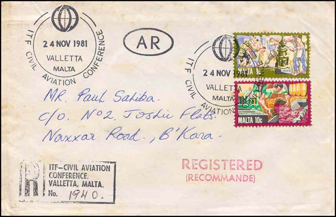Malta – Civil Aviation Conference organized by ITF from 24 to 27 November 1981 Envelope cancelled by the circular commemorative hand stamp dated 24 November 1981 (opening day of the Conference) and showing the ITF emblem in use at that time. Sent from the temporary post office at the conference location, this registered envelope also bears the AR letters in oval design (registered letter with acknowledgment), the cachet REGISTERED (RECOMMANDE) in red, and the registration hand-stamp “R / ITF-CIVIL AVIATION / CONFERENCE. / VALLETTA, MALTA.” in a black rectangular frame.