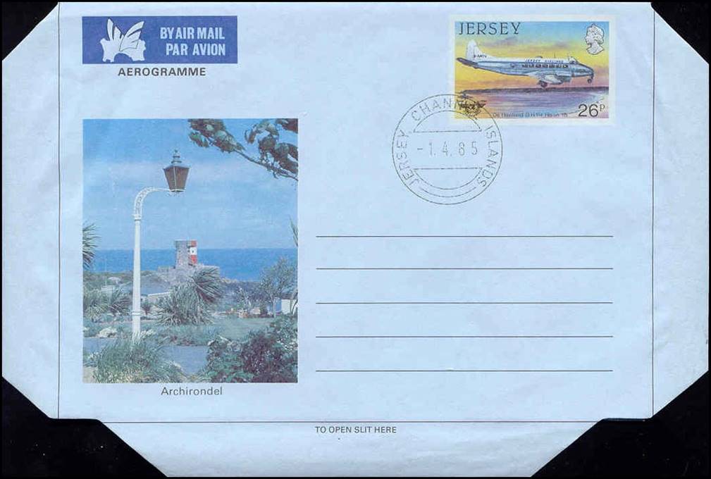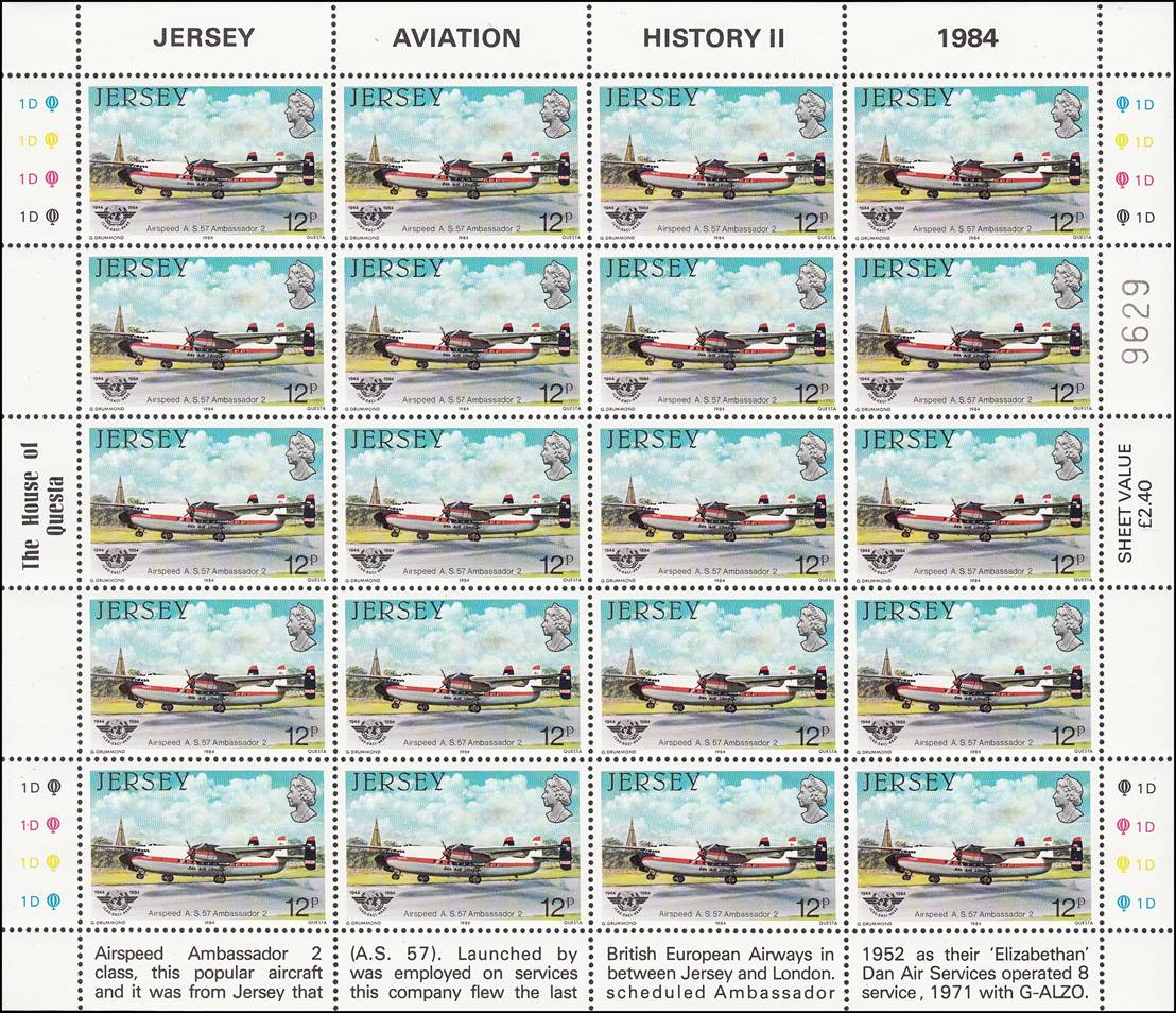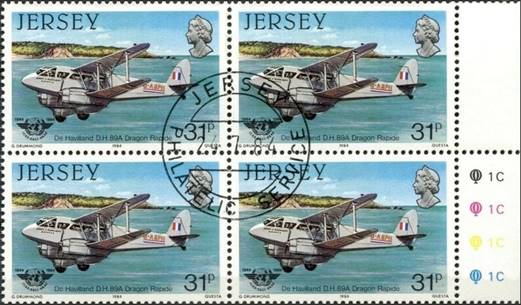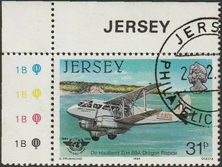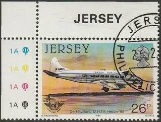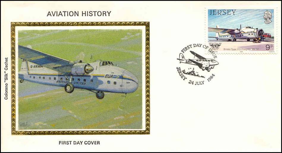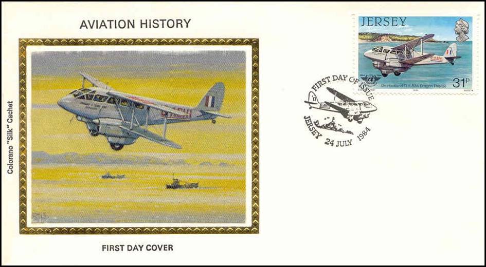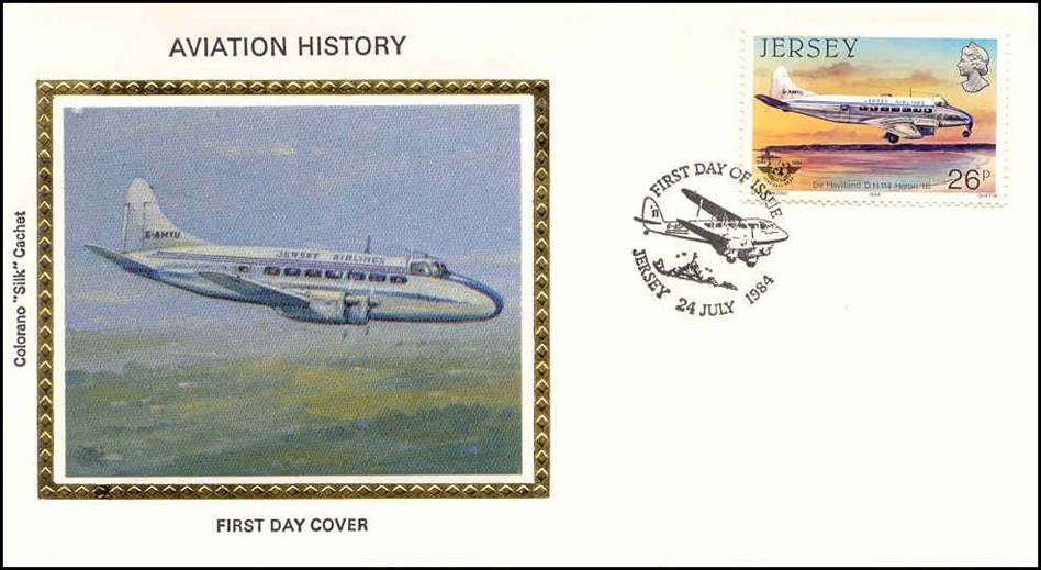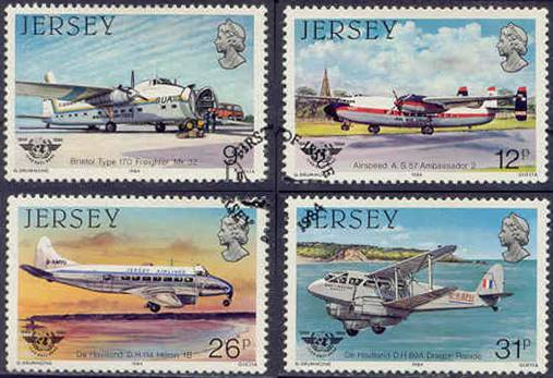 Background: This set depicts four aircraft types that contributed significantly to the development of Jersey aviation during the period of outstanding growth following World War II. The official First Day Cover of this issue notes Aviation History II. On 16 May 1973, Jersey released the first set of four stamps to commemorate aviation history in Jersey. Jersey, one of the Channel Islands, is a small island (44 square miles) that lies 12 miles west of the French Cotentin Peninsula and 100 miles south of England’s southern shores. It is an independent territory of the British crown. Jersey used British stamps until 1 October 1969, when its postal administration became independent.