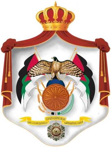 throne. Its scarlet color represents sacrifice, while the white The two flags are the flags of the Great Arab Revolt. The eagle in the center of the coat of arms symbolizes power, might and loftiness. The eagle is perched on the globe, and his wings touch the two flags of the Great Arab Revolt. The blue color of the globe symbolizes the spread of Islam across the world. The bronze shield in front of the globe represents the defense of truth and right in the world. The spears, swords, bows and arrows are traditional Arab weapons. Below the shield to the left are three branches of wheat, and to the right is a palm branch. Stretching down from between the wheat and palm branches is the highest Jordanian medal, the decorative order of al-Nahda. A yellow ribbon, placed across the ribbon of the Al Nahda First Order Medal, is composed of three parts inscribed with phrases, as follows: on the right: “Abdullah I ibn Al Hussein Bin Aoun (Aoun, the great-grandfather of Sharif Al Hussein Bin Ali)”; in the middle: “King of the Hashemite Kingdom of Jordan”; on the left: “Who seeks support and guidance from God”. |