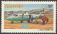 Depicts a Mosotho horseman accompanying his wife to the airport; de Havilland Canada DHC-6-300 Twin Otter from Lesotho Airways, registered 7P-LAP in Lesotho; 50th anniversary logo. |