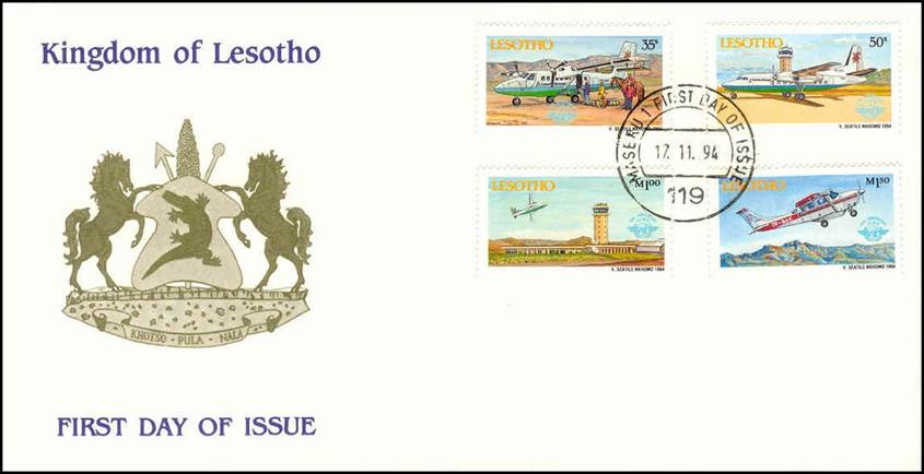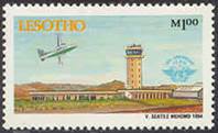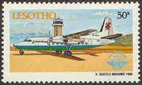 Depicts a Fokker F-27-600 Friendship plane, registered 7P-LAJ in Lesotho, from Lesotho Airways at the Moshoeshoe International Airport, Maseru, Lesotho; 50th anniversary logo. |