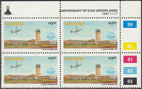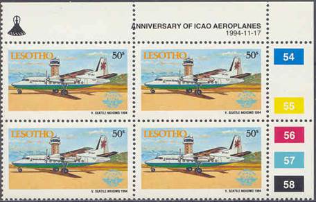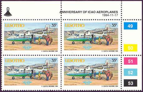 The information on the selvage (i.e. the marginal paper on the pane) of these blocks of four stamps shows an incorrect inscription: ANNIVERSARY OF ICAO AEROPLANES. An error is introduced here due to the missing character separating ICAO and AEROPLANES; alternatively, the word AEROPLANES should have been printed on a separate line to avoid any misunderstanding. Shows the date of issue: 1994-11-17.