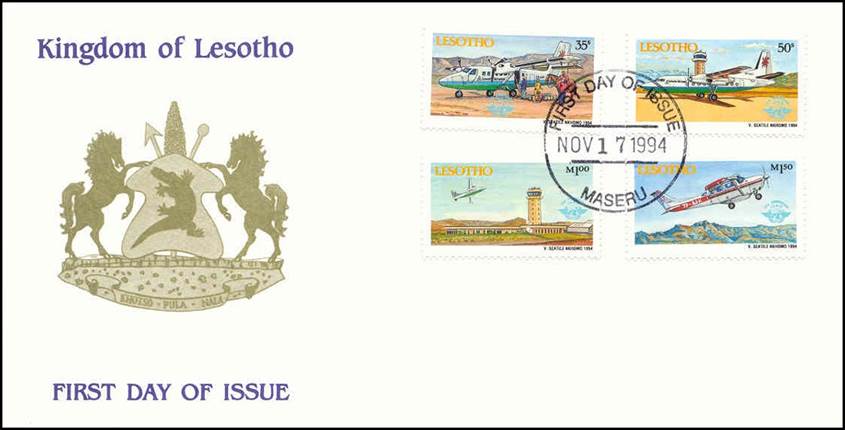 Depicts a Fokker F‑27 Friendship (in a climbing turn to the left) flying over the Moshoeshoe International Airport, Maseru, Lesotho; 50th anniversary logo. |