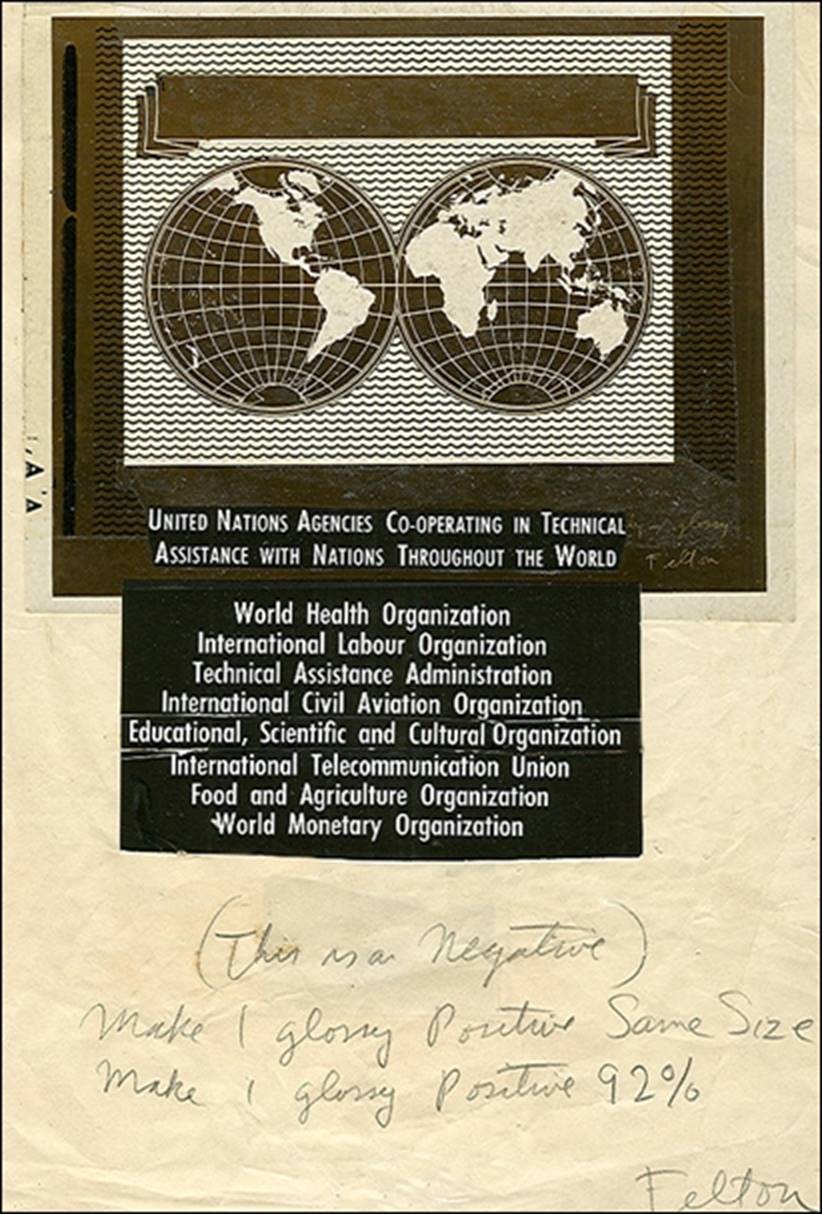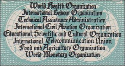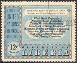 Lists the United Nations Agencies co-operating in technical assistance with nations throughout the world, and in particular in Liberia (from top to bottom): World Heath Organization, International Labour Organization, Technical Assistance Administration, International Civil Aviation Organization, Educational Scientific and Cultural Organization, International Telecommunication Union, Food and Agriculture Organization, World Monetary Organization. World hemispheres in the background.