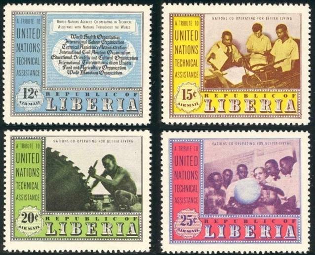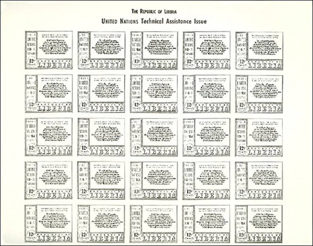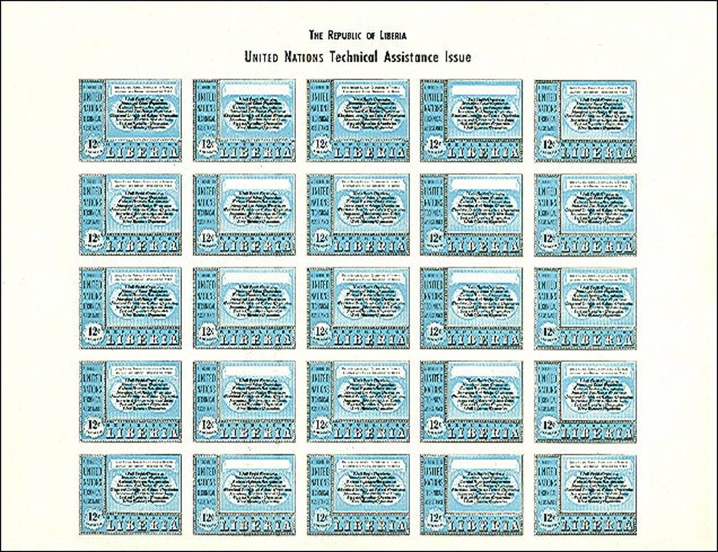 Full sheets (perforate and imperforate) of 25 stamps with marginal inscription: THE REPUBLIC OF LIBERIA / UNITED NATIONS TECHNICAL ASSISTANCE ISSUE: