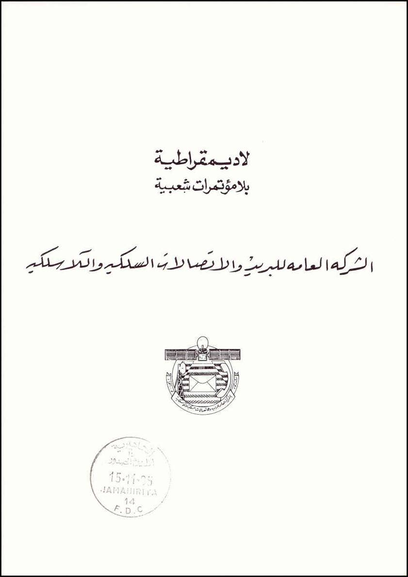 Presentation folder of this issue. The inside page shows the emblem of the Posts & Telecommunications of Libya.
