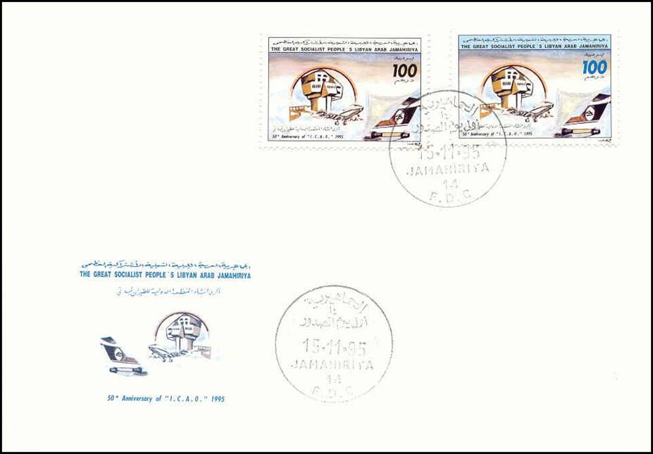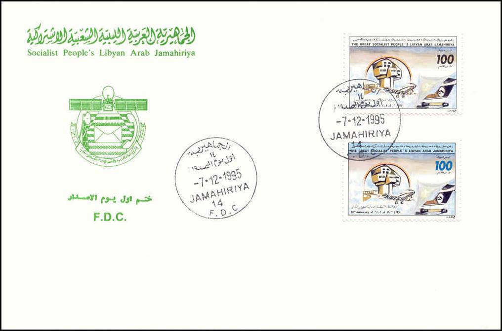 Official cover released by the Posts & Telecommunications of Libya on 7-12-1995, i.e., on International Civil Aviation Day (ICAD). The cachet shows the emblem of the Posts & Telecommunications.