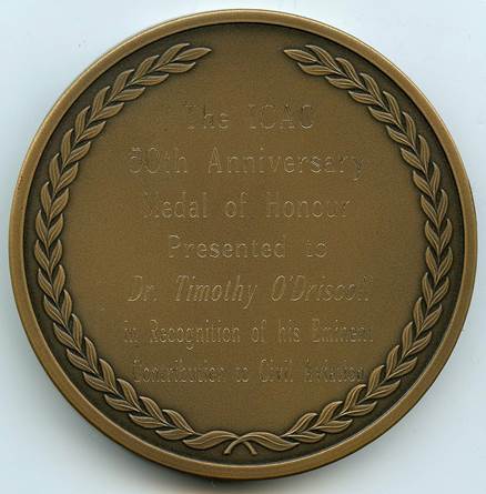 The reverse indicates that this medal (see here-below) had been awarded to Dr. Timothy O'Driscoll from Ireland. He was part of the Irish Delegation at the Chicago Conference where Ireland secured for many years the compulsory stopover at Shannon Airport on the transatlantic routes. Later he became the Delegate representing Ireland on the Interim Council of PICAO. One of the most important contributions to Irish aviation made by Dr. O'Driscoll and for which he was proudest was the procedure which led to the introduction of the world's first custom-free airport at Shannon right after WWII, designed to provide a service for trans-Atlantic airline passengers typically travelling between Europe and North America whose flights stopped for refuelling on outbound and inbound legs of their journeys. This in turn led to the ‘Duty and Tax-Free’ shopping concept which has since been copied at airports around the world.