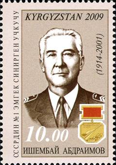 The Som is the currency unit of Kyrgyzstan in use since it gained independence from the Soviet Union in 1991. A first stamp commemorating Abdraimov was issued by Kyrgyzstan in 2009 (see at left) with face value of 10-Kyrgyzstani Som.