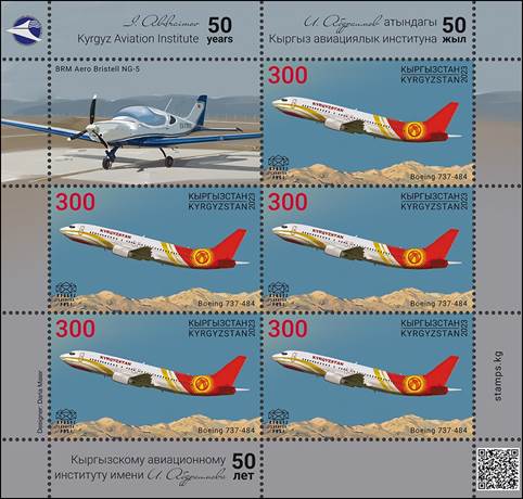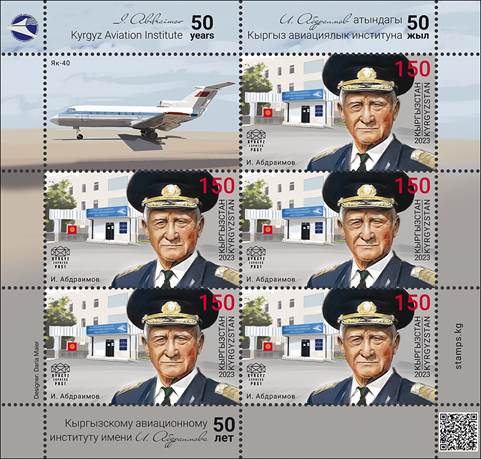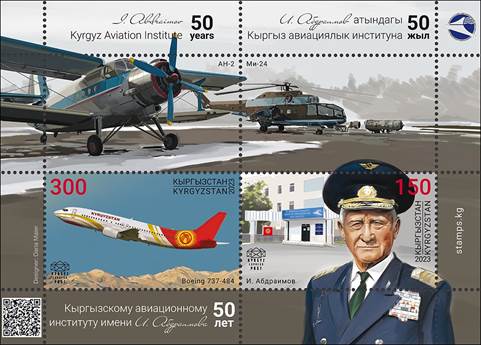 Mini-sheet with two labels at the top and two stamps. The stamp at the lower right with the face value of 150-Som features a portrait of the founder of the higher aviation educational institution of the Kyrgyz Republic, Ishembay Abdraimov, against the backdrop of the central entrance to the institute building. The two labels of this sheet feature (from left to right): an AN-2 aircraft and a Mi-24 helicopter, located on the territory of the KAI. The 300-Som stamp at the lower left features a Boeing 737-484 in a fantasy livery used by airlines in Kyrgyzstan. |