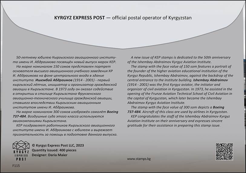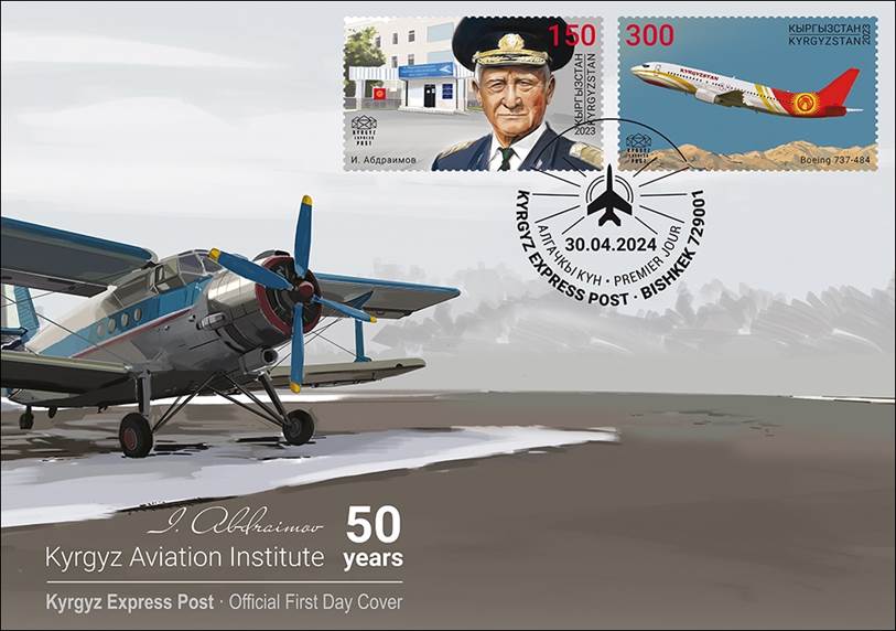 Another case of indirect relation with ICAO is the issue (shown below), on 30 April 2024 by the Ministry of Digital Development of the Kyrgyz Republic. of a series of 2023 Kyrgyz Express Post postage stamps commemorating the 50th Anniversary of the Ishembay Abdraimov Kyrgyz Aviation Institute (KAI), which is an educational organization of higher professional education in the field of civil aviation and provides initial training, retraining, and advanced training of flight and technical specialists for civil aviation. The Kyrgyz Aviation Institute was founded in 1923.