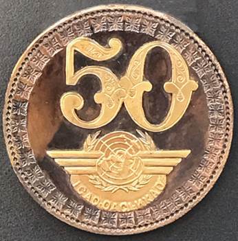Medal (font and back) commemorating ICAO’s accession to the United Nation Organization. Medal released in 2024. |