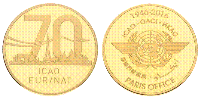 The ICAO European and North Atlantic (EUR/NAT) Office marked its 70th Anniversary on 7 July 2016. A special emblem was designed on this occasion (see below). Furthermore, a project for medals was discovered on the website of leThaler, French manufacturer of personalized coins (see sample below). According to the available information, this project did not materialize.