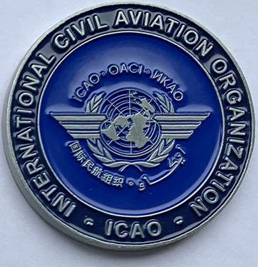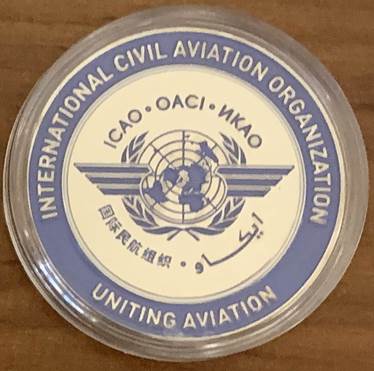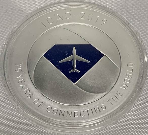 On the occasion of the 75th anniversary, ICAO requested by tender the supply of 2000 commemorative coins. The coins were eventually manufactured in China. The coin/logo designer for the ICAO 75th branding was Anthony Philbin, Chief of the COM (Communications) Section at ICAO. Characteristics of the coin: Weight: 62.2 gr; Colour: silver and blue; Fineness: Ag999.
