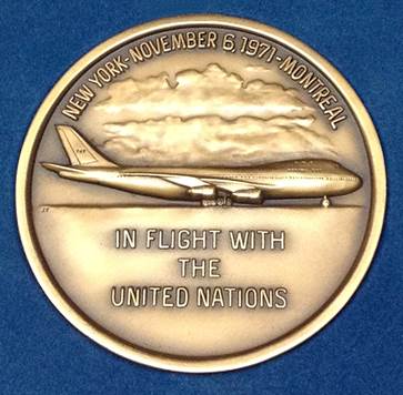 United Nations bronze medal. Marked on one side 'NEW YORK-NOVEMBER 6, 1971-MONTREAL / IN FLIGHT WITH THE UNITED NATIONS' and on the other 'AVIATION SAFE PASSAGE THROUGH INTERNATIONAL LAW'. It measures