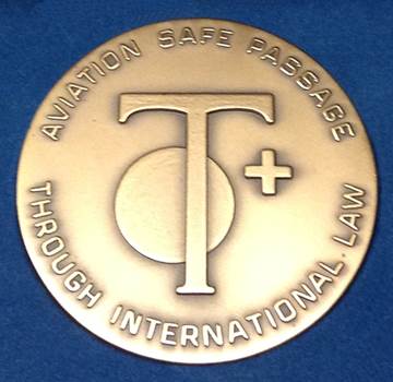 The guests of the UN flight (6 November 1971) heard a strong appeal for international legislation and the symbols shown on the medal mean support for international skyjacking treaties: The world (circle) requires more (+) treaties (T).