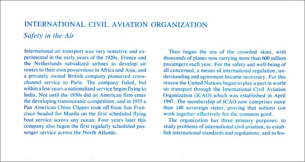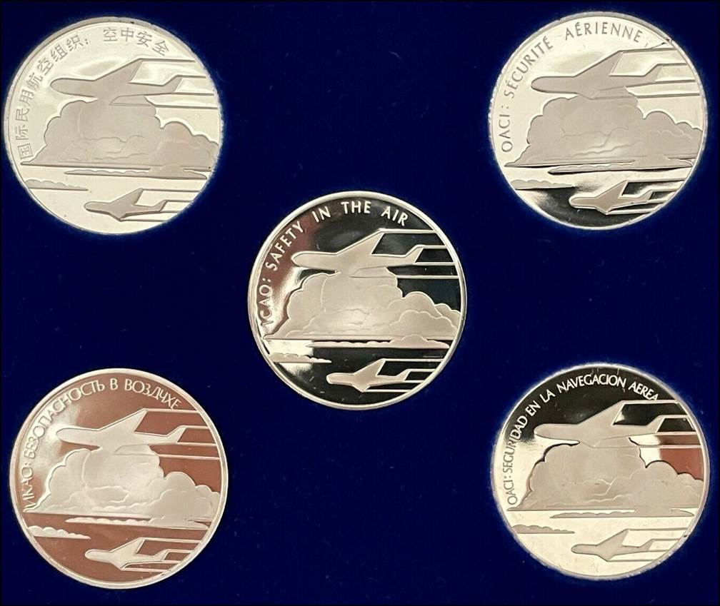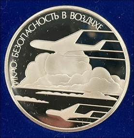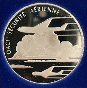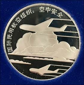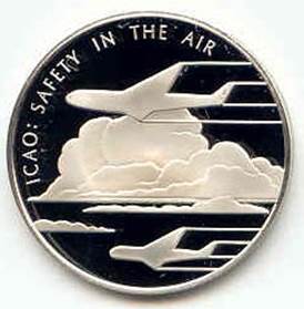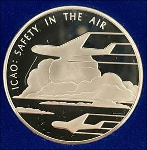 The obverse depicts two jet planes streaking across the sky as symbols of the many thousands safely flying the international routes.