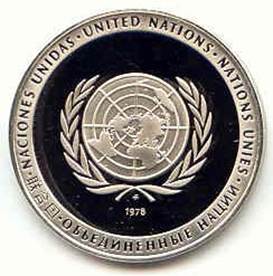 The reverse shows the United Nations emblem. The outside circle shows the UN name in five languages (Chinese, English, French, Russian and Spanish).