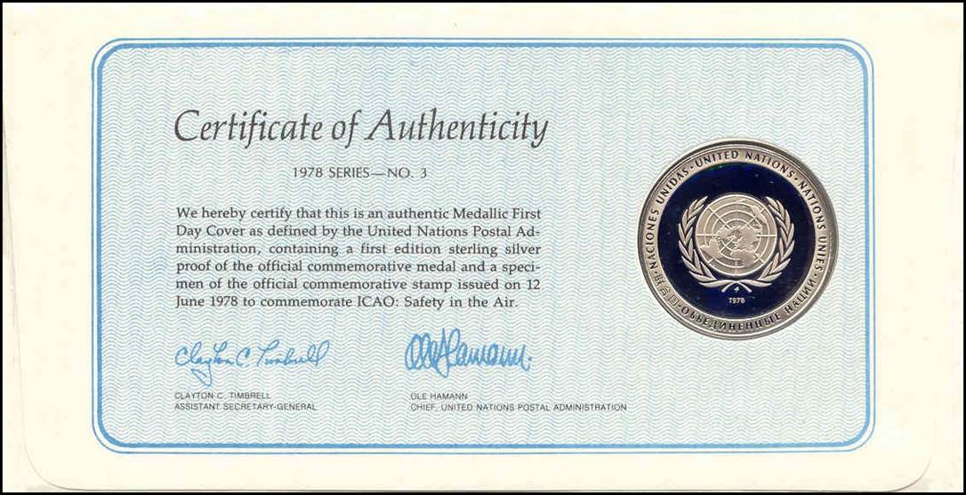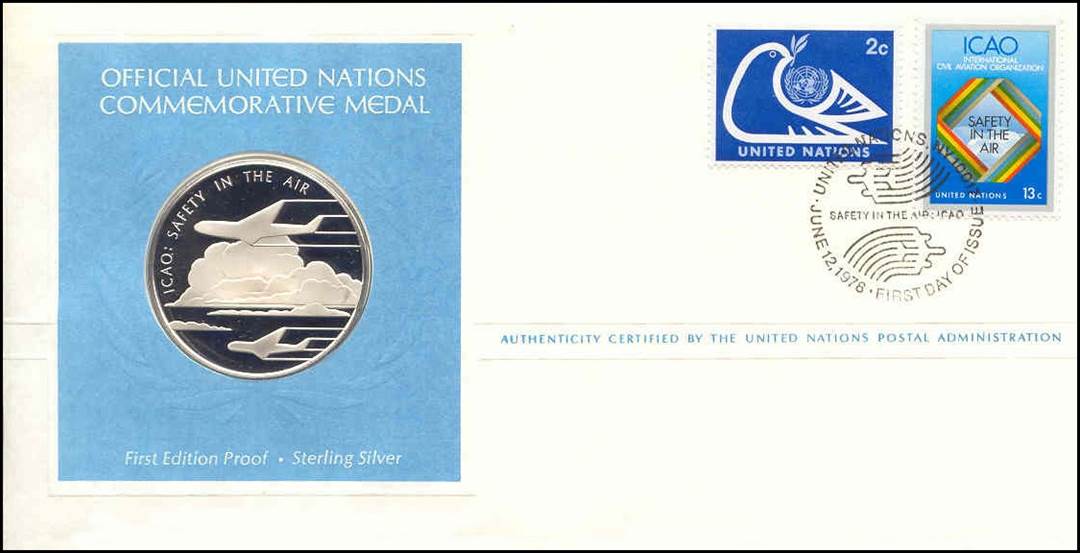 First Day Cover – United Nations - 12 June 1978 – Safety in the air The cacheted envelope houses the silver medal in protective plastic with the UN stamp tied to the envelope with an official First Day of Issue cancel of 12 June 1978. The matching stamp of the First Day Cover is the 13-cent stamp issued by the UNPA on 12 June 1978.