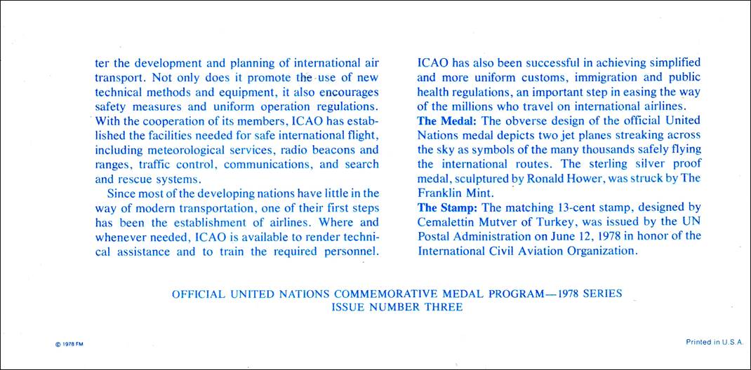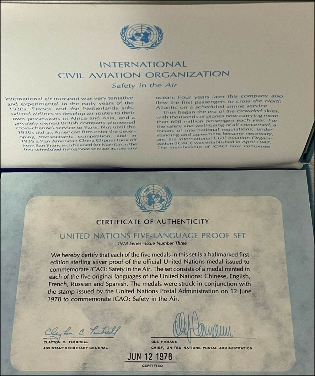 The year 1978 celebrated the 75th anniversary of the first engined-powered flight by the Wright Brothers. This occasion prompted the United Nations Postal Administration (UNPA) to issue on 12 June 1978 two sets of stamps (with US and Swiss denominations) to praise ICAO’s achievements over the past three decades; the subject of the issue was Safety in the Air. The medal, in sterling silver (Weight: 20 g, 92.5% Silver), proof strike, measures 38 mm (1.5” inches) in diameter and was sculptured by Ronald Hower and struck by the Franklin Mint (Mint mark: "FM").