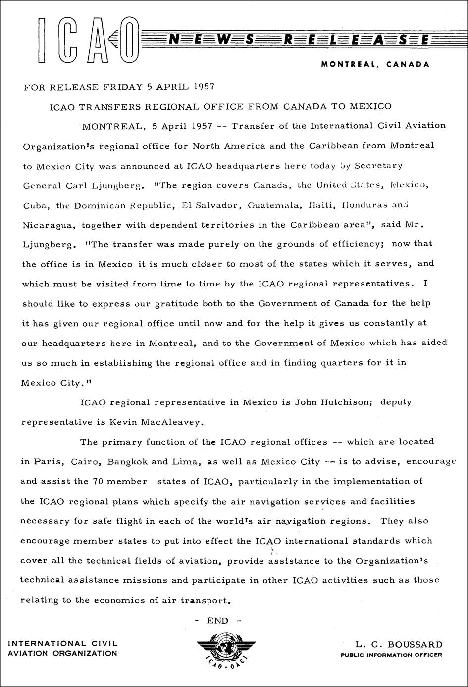 News release from ICAO Public Information Office (1957/13) related to the establishment of the Office in Mexico City.