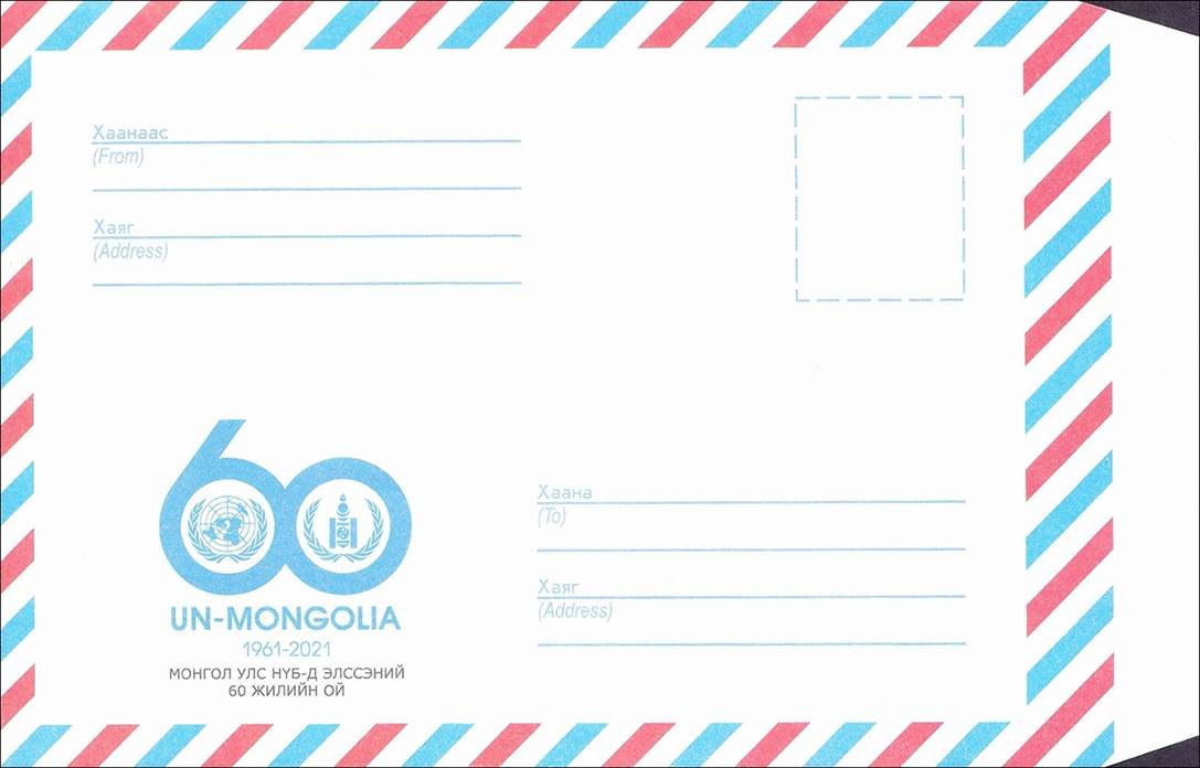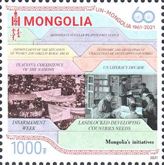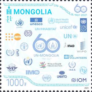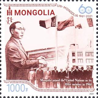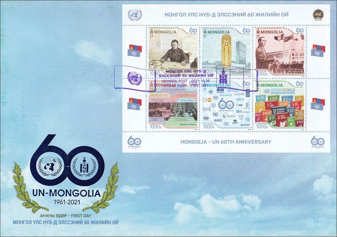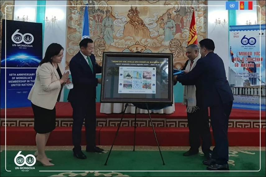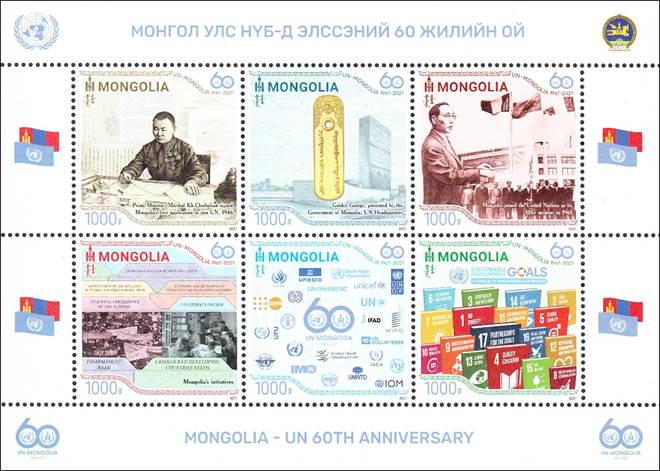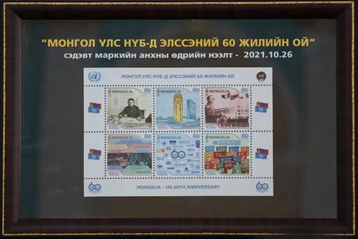 Unveiling of the souvenir sheet The opening ceremony of the first day of the postage stamp “60th anniversary of Mongolia's accession to the United Nations” was held on 26 October 2021 as part of the “UN Week” (from 20 to 27 October) series of events to mark the 60th anniversary of Mongolia's accession to the United Nations and to promote the significance of this historical milestone to the Mongolian public. It was held in the “Номин” танхимд of the Ministry of Foreign Affairs in Mongolia. The opening ceremony was attended by N. Ankhbayar, State Secretary of the Ministry of Foreign Affairs, Mr. Tapan Mishra, UN Resident Coordinator, B. Ankhbaatar, Executive Director of Mongol Post Office, Senior Diplomats and Researchers.