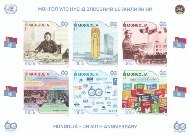 Miniature sheet (140x100mm) commemorating the 60th anniversary of the admission of Mongolia to the United Nations (UN) on 27 October 1961. The sheet consists of six postage stamps (36x36mm) of 1000 ₮. The margins show the flags of the UN and Mongolia. At the top right is the state emblem; in the lower margin is 60th anniversary emblem. Description of the stamps (from left to right, and from top to bottom): 1. First stamp: Prime Minister Marshal Khorloogiin Choibalsan signing Mongolia’s first application to join United Nations in 1946. 2. Second stamp: Golden Gerege presented by the Government of Mongolia; in the background: UN Headquarters in New York. 3. Third stamp: Mongolia joined the United Nations as its 101st Member in 1961. Yumjaagiin Tsedenbal, First Deputy Minister of Foreign Affairs, who addressed the UN General Assembly in 1961. Shown at the left of the eleven Delegates; four people of the Mongolian Delegation after raising the country’s flag in One UN Plaza in New York. 4. Fourth stamp: Mongolia’s initiatives at the UN (see footnote). 5. Fifth stamp: 60th Anniversary logo of Mongolia's admission to the United Nations surrounded by emblems of the various Organs, Organizations, and Specialized Agencies of the UN, including ICAO’s logo. 6. Sixth stamp shows the 17 UN Goals to transform the world.