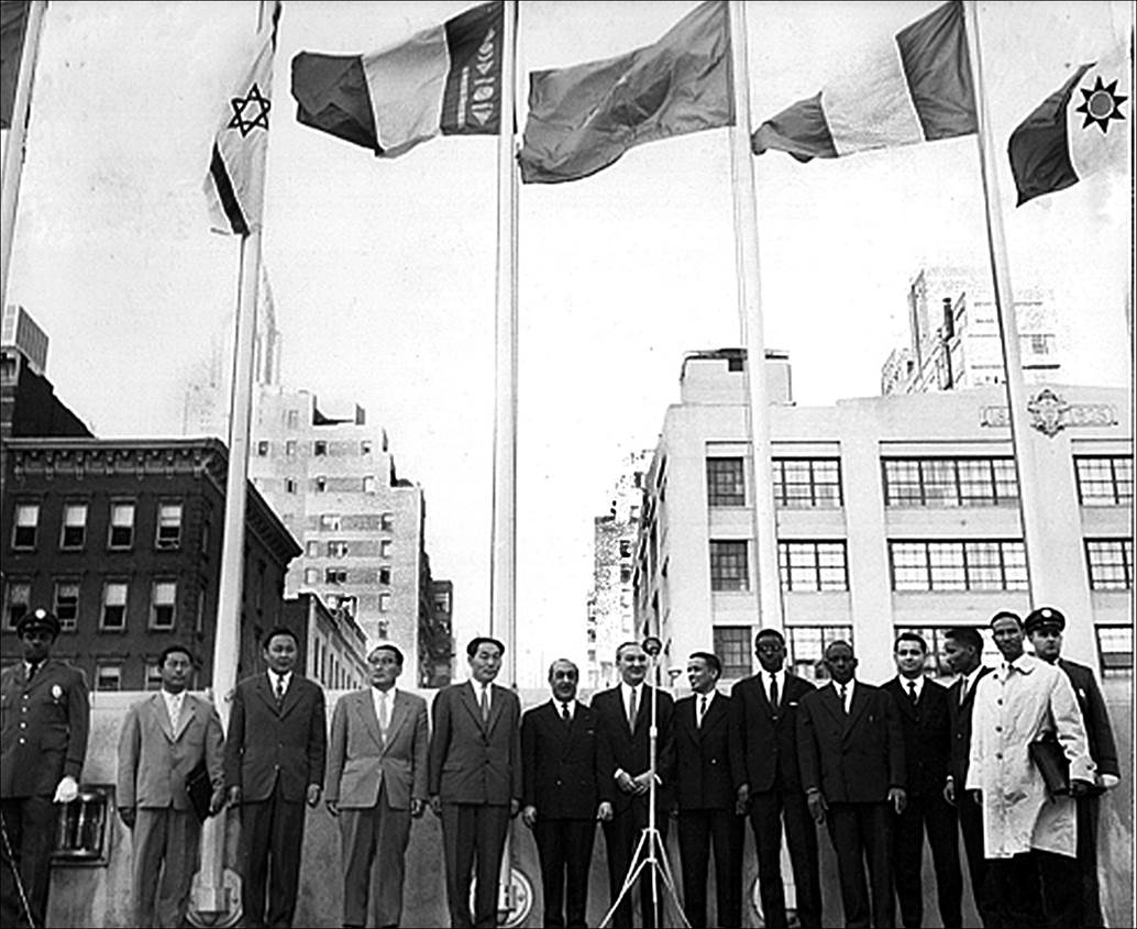 Further to the independence of Mongolia, the prime minister of the Mongolian People’s Republic (MPR), Khorloogiin Choibalsan, applied for UN membership on 24 June 1946. The entry of Mongolian People's Republic (MPR) into the United Nations (UN), from its first application in 1946, took 15 years. In the context of the global Cold War, UN membership became a tool to strengthen the influence of the USA and the Soviet Union. They supported the membership of their respective clients, while opposed it for clients of their adversary. Consequently, from 1947 to 1955, no new members joined the organization for 8 years. However, the extension of UN membership to the newly independent African countries in the mid-1950s led to a US-Soviet struggle for allies among them. In this regard, the Soviet Union succeeded in linking the package admission of the MPR and Mauritania with the issue of China's representation. The USA, seeking to ingratiate itself to new African UN members and thus gain their collaboration on the question of China's representation and other UN issues crucial to American interests, ultimately compromised, consenting to the MPR's entry. Since Mongolia first applied to join the United Nations in 1946, it has repeatedly applied in 1947, 1948, 1949, 1952, 1955, 1956, and 1957. Between 1946 and 1961, Mongolia's accession to the United Nations was discussed 13 times in the General Assembly. In conclusion, the MPR's admittance to the UN was the result of the struggles and compromises of the two superpowers. On 25 October 1961 at its 971st Meeting, the UN Security Council passed Resolution 166(1961) recommending to the General Assembly that Mongolia be admitted to membership in the United Nations with nine votes to none and one abstention; on 27 October 1961 at the 1043rd Plenary Meeting of the 16th Session, the UN General Assembly adopted Resolution A/RES/1630(XVI) admitting Mongolian People’s Republic to the United Nations. Minister of Foreign Affairs B. Jargalsaikhan, Deputy Minister of Foreign Affairs Dondog Tsevegmid, Bayar Dashtseren and B. Vanchindorj travelled from Mongolia to the UN on this occasion in 1961 and are shown in the picture below. On the same day, the Islamic Republic of Mauritania was admitted to the UN; their Delegates are therefore shown in the picture below.
