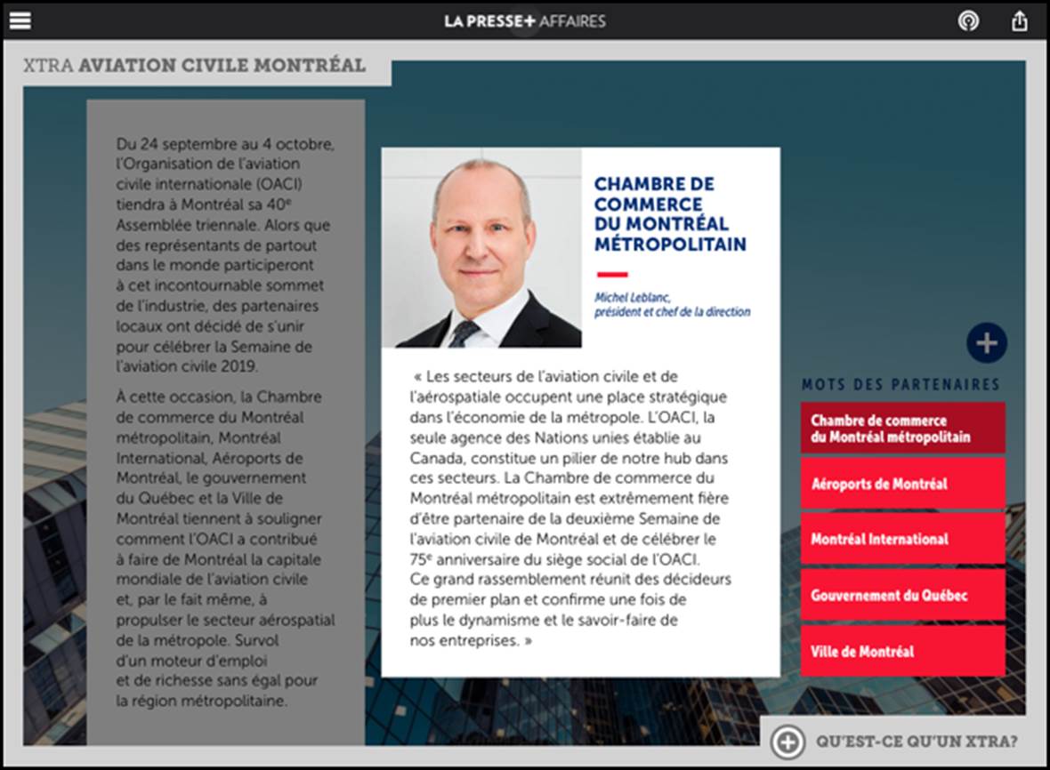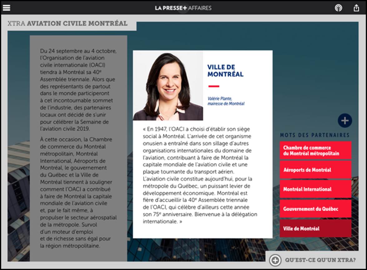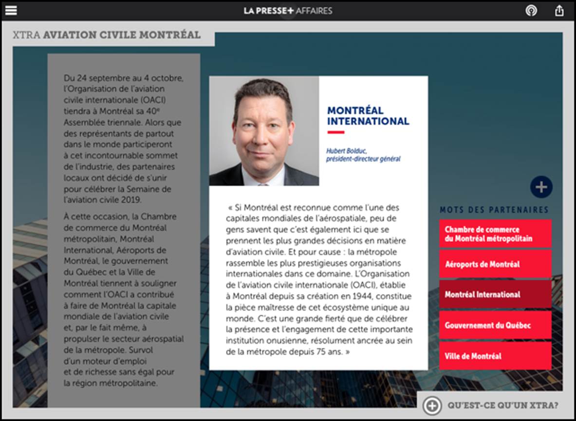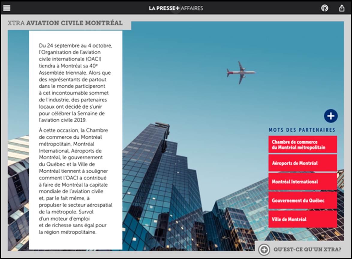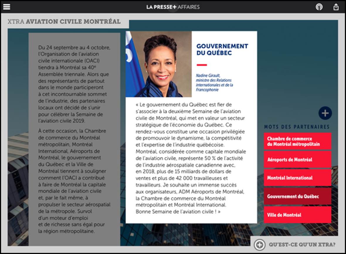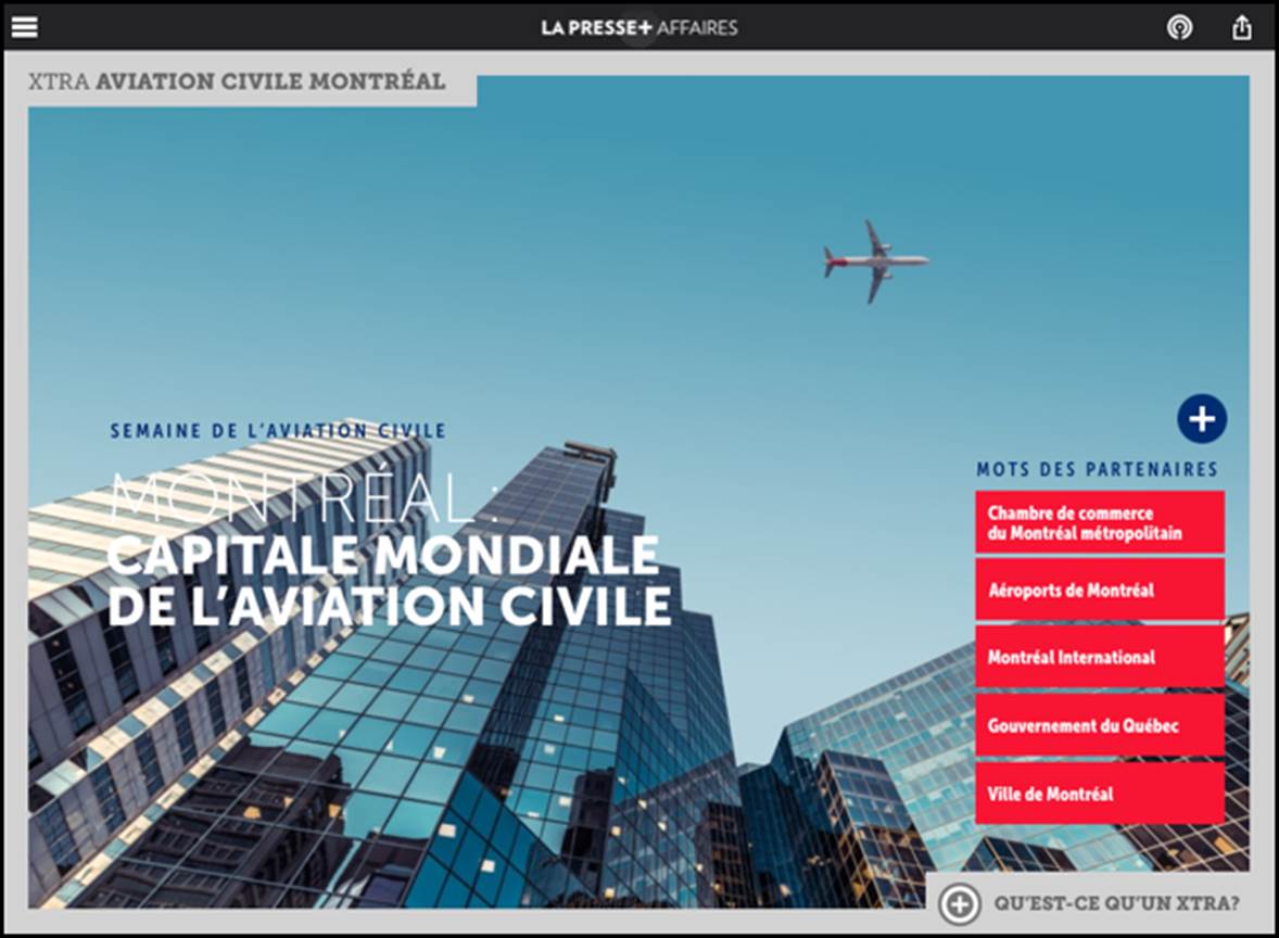 On 23 September 2019, the La Presse+ newspaper tablet edition published a special folder titled “Montréal – World Capital of Civil Aviation”. The pages of this folder are displayed hereafter.
