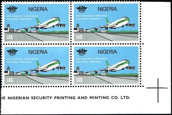 Boeing 747 taking off at the airport; ICAO logo. Watermarked paper. |