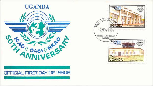 Uganda – 14 November 1994 - 50th Anniversary of ICAO Unusual (hand-drawn) design of the ICAO emblem in the cachet. |
