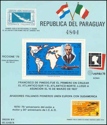 Paraguay issued this very eventful souvenir sheet commemorating the 50th anniversary of Francesco de Pinedo’s Western Hemisphere flying boat tour, the 30th anniversary of ICAO, the 75th anniversary of the first engine‑powered flight by the Wright Brothers, and the famous masters’ stamp exhibitions: Riccione ’78 and Eurphila ’78 (Roma, 20-24 September 1978). |
