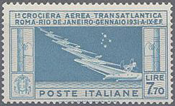 Background: The central stamp depicts a world map and the flight route covered by Francisco de Pinedo in 1927. This souvenir sheet commemorates the 50th anniversary of de Pinedo’s world tour in 1927, reaching three continents with a double-crossing of the Atlantic Ocean and promoting a sense of national pride among Italians living abroad. Francesco de Pinedo was an active promoter and participant in a series of good-will tours to various points on the globe. Whereas all of these flights were impressive in nature, de Pinedo’s tour of the Western Hemisphere was a particularly outstanding feat that brought the Italian aviator international acclaim. More background information on this tour can be found by clicking on: De Pinedo Delayed Over Canada.