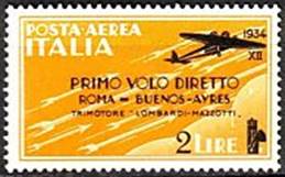 In the upper-left corner of the sheet is a reproduction of an Italian stamp issued on 15 December 1930 named: Transatlantic Squadron; it was issued in connection with the transatlantic flight by Italian aviators from Rome to Rio de Janeiro, Brazil (17 December 1930 ‑ 15 January 1931). In the lower-right corner of the sheet is a reproduction of an Italian stamp which was surcharged, overprinted and issued on 18 January 1934. The original stamp in yellow color was never issued; however, the same design in deep blue (i.e. arrows over the sky and clouds) was used for a stamp issued on 12 March 1930. The depicted stamp shows a surcharge of a black digit 2 at the bottom-right corner, and a black overprint of: 1) an aircraft with 1934/XII; 2) Primo Volo Diretto / Roma‑Buenos Aires / Trimotore ‑ "Lombardi‑Mazotti" in three lines. |