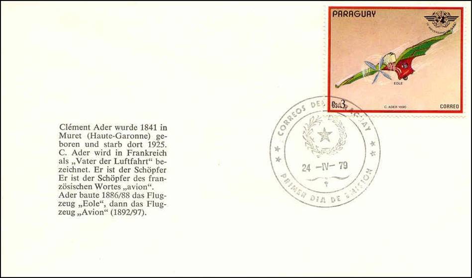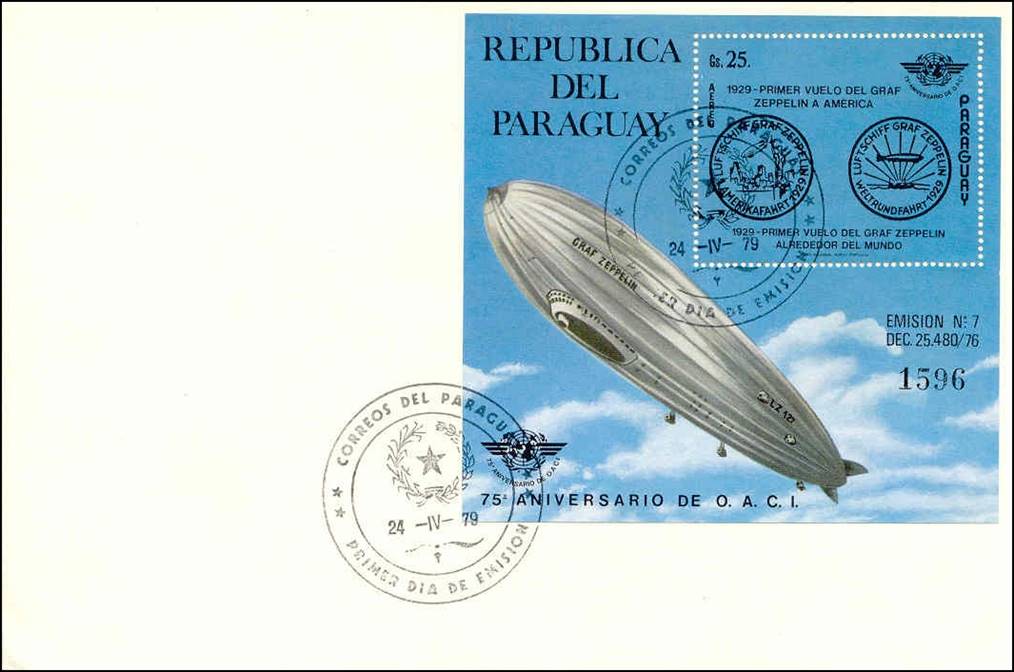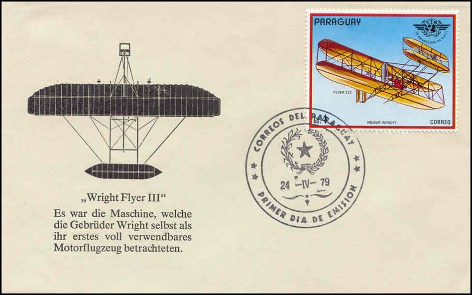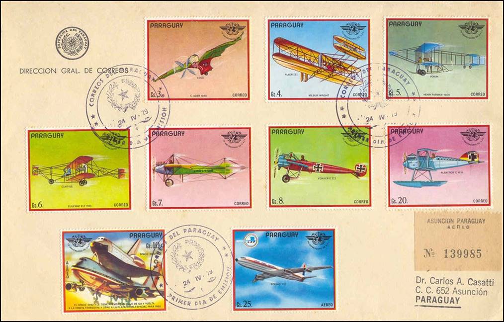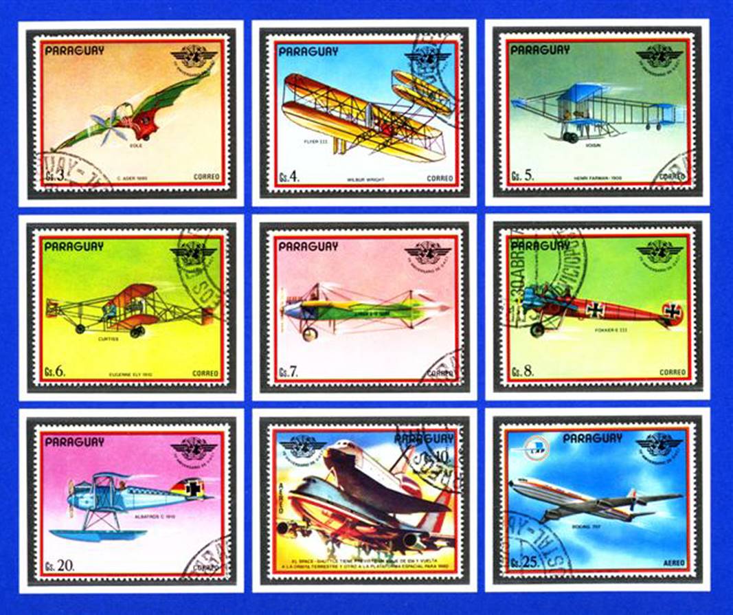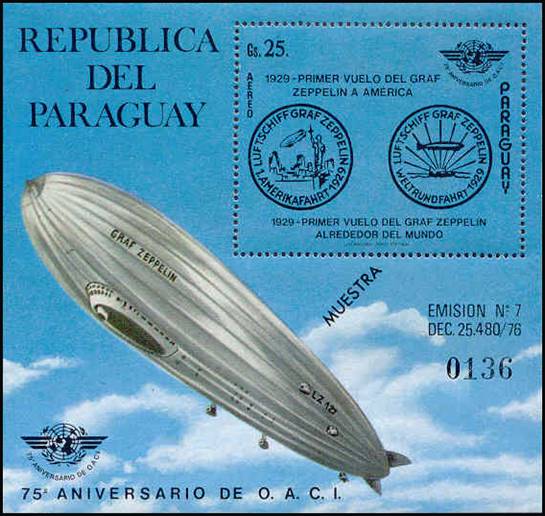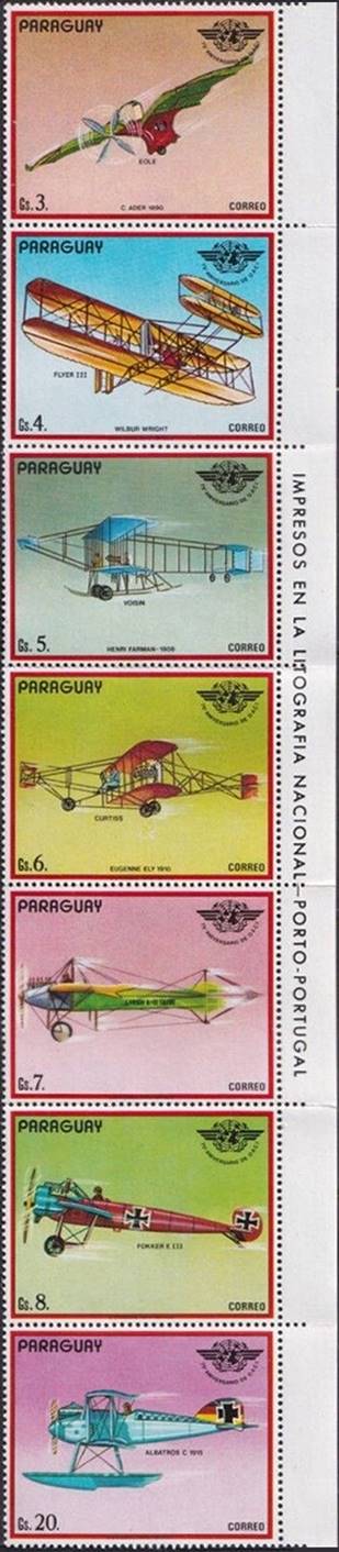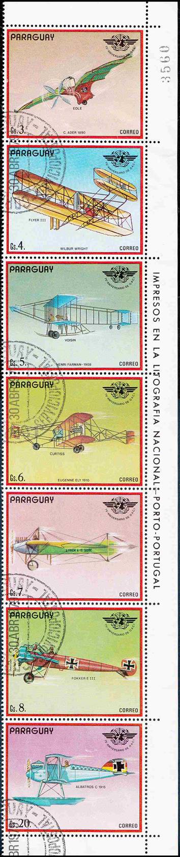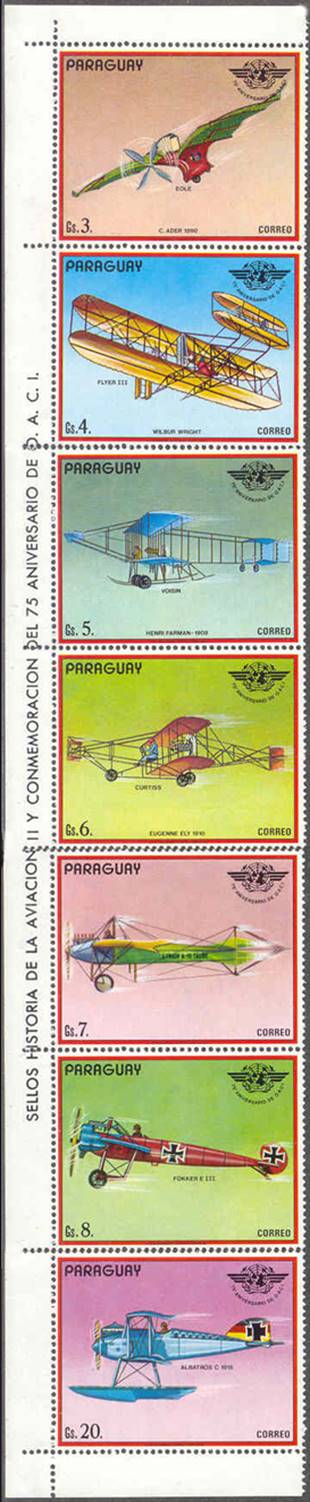 Background: The designer of those stamps included the ICAO emblem, surrounded by 75o Aniversario de OACI. Paraguay inadvertently confused the 75th anniversary of the Wright brothers’ triumph, who made the first successful flight of a manned heavier-than-air vehicle on 17 December 1903, with ICAO which, even today, has not yet reached such a milestone. Furthermore, it should be noted that the date of issuance of this set by Paraguay did not correspond to an anniversary of the first flight (which should have been in 1978) nor to an anniversary celebrated by ICAO. This issue should have more rightly commemorated the 30th anniversary of ICAO (in April 1977), and not its 75th anniversary. The first seven stamps of this issue were printed in se-tenant strip (Text in the selvage: SELLOS HISTORIA DE LA AVIACION II Y COMMEMORACION DEL 75 ANIVERSARIO DE O.A.C.I.). The last two values are airmail stamps that were printed in separate sheets. Specimen stamps also exist and are shown here above.