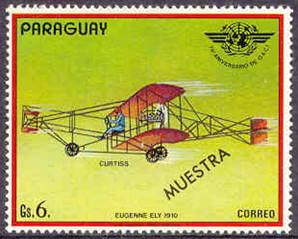 Curtiss Golden Flyer biplane (with a pusher configuration, as the propeller was behind the pilot) flown by Eugene Ely on 14 November 1910 for the first‑ever take‑off from a ship. Error in spelling of the first name: Eugene is spelled with two 'n'. More background information on this stamp can be found by clicking on: Philatelic Laxity: Eugene Ely.