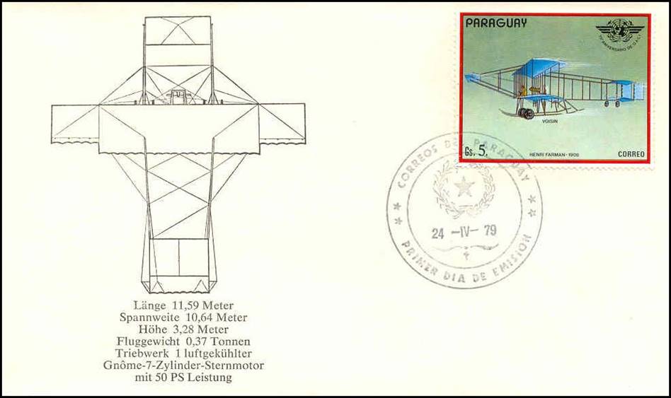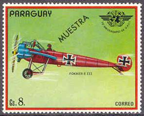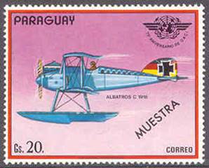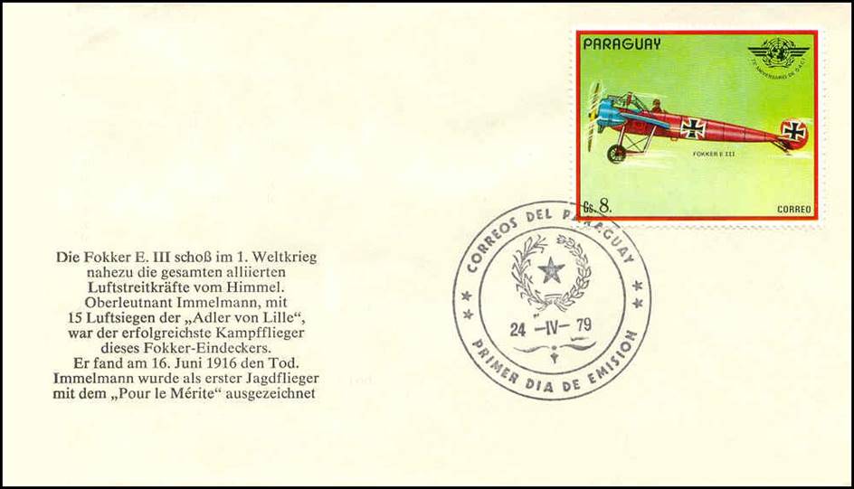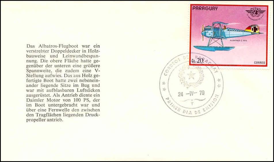 Paraguay, with a total population close to 5 million, has today some 166,000 German speakers. The first Germans appeared in 1881 in Paraguay in the form of five families coming from Berlin, which established themselves in San Bernardino and founded in 1888 the town named Nueva Germania. With the establishment of Hohenau (45 km above Encarnación) in 1899, German colonization at the upper Parana, so important for the further development, began; most of the Germans who settled in this region came from the larger German colonies from neighbouring Brazil and Argentina which were well experienced in subtropical agriculture. During 1900-1914, numerous predominantly German settlements developed on the west bank of the upper Parana. When the Communists came to power in Russia, the German speaking population was persecuted by the new Soviet Government; some Russian Mennonites saw Paraguay as a perfect place to settle because it looked isolated. The presence of a large German community in Paraguay and the fact that several aircraft of this series relate to the WWI German Air Force may have triggered the release of first day covers with German text.