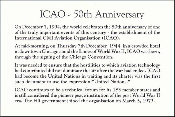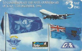 Date of issue: 7 December 1994 for the 50th anniversary of ICAO. Two cards were issued with values of $3 and $10; the $10-card was issued in a special presentation folder shown hereafter.