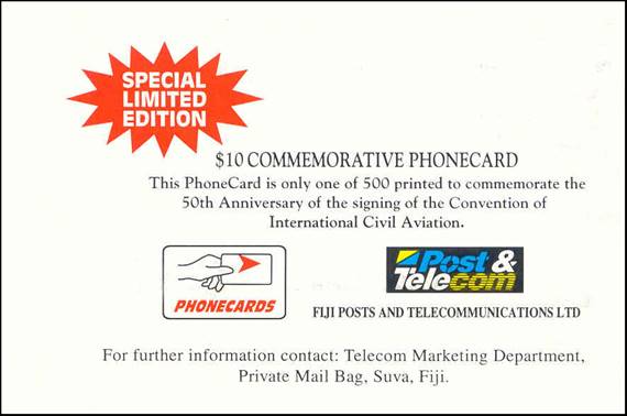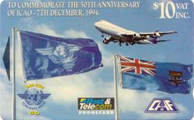 Fijian Dollar $3 GPT (Get Paid To) prepaid magnetic phone card. ICAO and Fiji flags; Air Pacific Boeing 747; 50th Anniversary logo; emblem of the Civil Aviation Authority of Fiji (CAAF). Tirage: 10,000 cards.