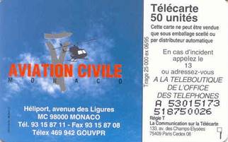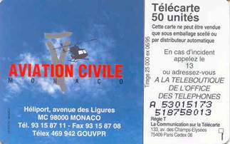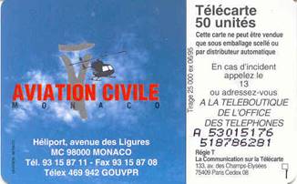 Issued in June 1995 for the 50th anniversary of ICAO. Value: 50 Units. Tirage: 25,000 copies. SOLAIC SO3 Chip. Designed by: Davidson, Monaco.